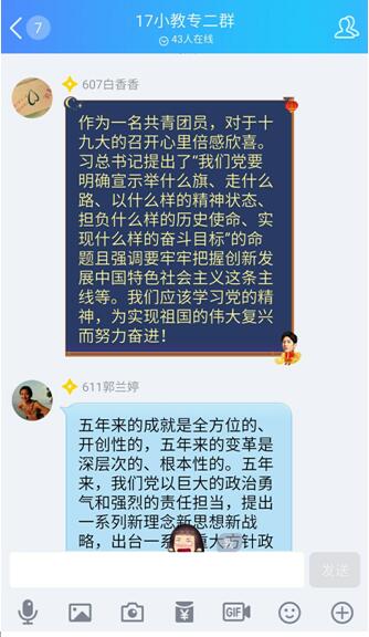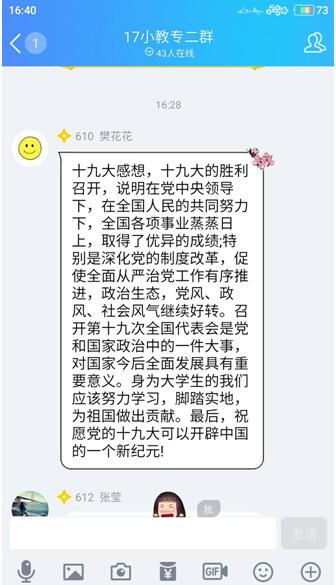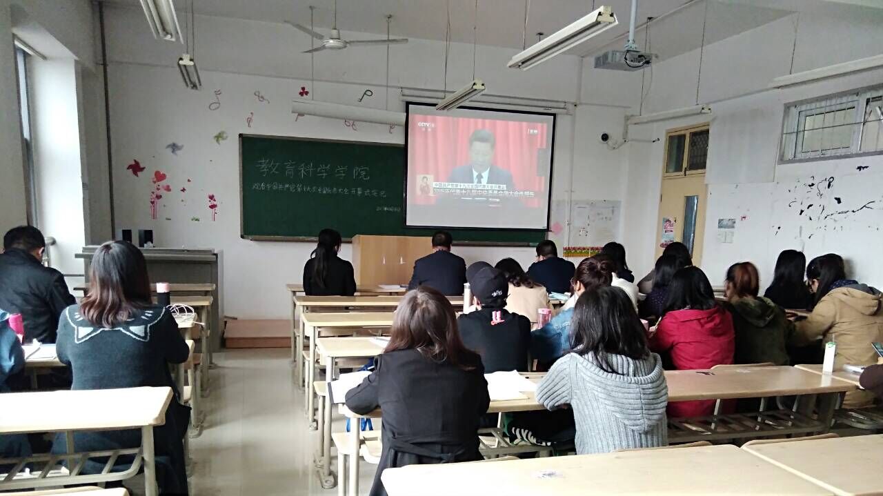 2017年10月18日下午,教育科学学院全体党员在1教楼C401教室集中观看中国共产党第十九次全国代表大会开幕会实况视频,观看之前肖新同志要求各位党员要认真观看、认真学习、做好记录,做好十九大报告精神的学习、传达和贯彻。并且专门建立了一个QQ群,以方便大家在观看过程的进行讨论,实时表达自己的感受。