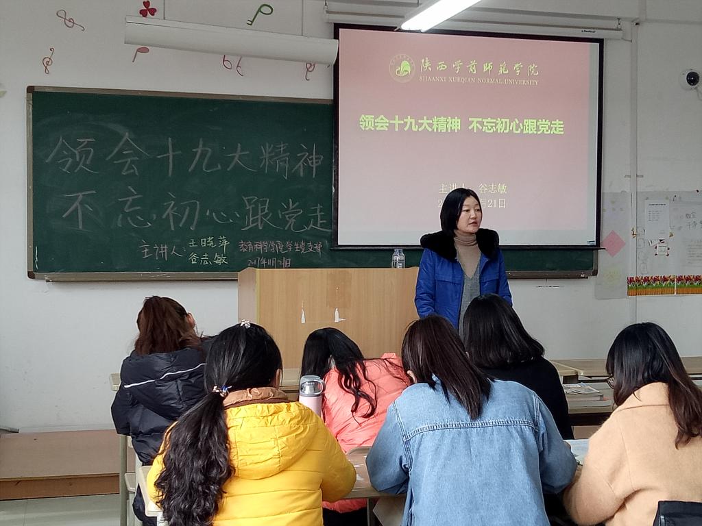 为加强对入党积极分子的培养教育,进一步提高入党积极分子的理论素养,不断厘清端正入党动机,2017年11月21日中午,教育科学学院学生一、二党支部在一教C401教室,对参加第41期党校的入党积极分子进行主题为"领会十九大精神,不忘初心跟党走"的党课学习,本次党课由王晓萍同志主持,由谷志敏同志主讲。