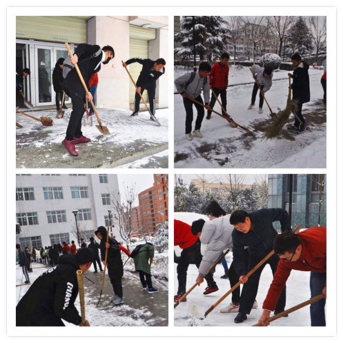 2018年首场大雪翩然而至,将校园装扮得银装素裹、玉树琼枝,分外美丽。雪天给大家带来美景和清新空气的同时,气候也变得异常寒冷,路面踩踏之后尤如冰面,给老师和同学们来往教室带来很大不便。为了缓解大家行走不便,减少安全隐患,在教育科学学院党总支的号召下,院学生会积极行动起来,立即联系劳动工具等, 1月4日中午,放弃午休时间,动员以学生干部、党员积极分子、受资助学生为主的10多名男生参加在1、4教学楼前义务扫雪活动。