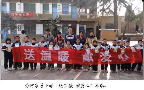 2010年12月社团开展了为何家营小学“送温暖献爱心”活动,为小学生们送去了学习用品、文体用品等物品,丰富了孩子们的学习和课余生活。社员们还和孩子们一同游戏拉近了彼此的心。